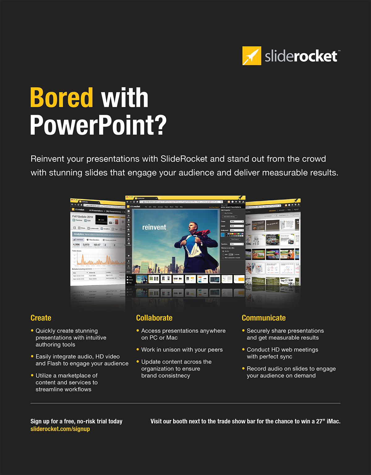 SlideRocket pioneered an online presentation platform that lets users create, manage, share, and measure presentations. Working with the head of marketing meant some great visual experiments to get the product in front of the most people possible. SlideRocket was sold to VMWare.